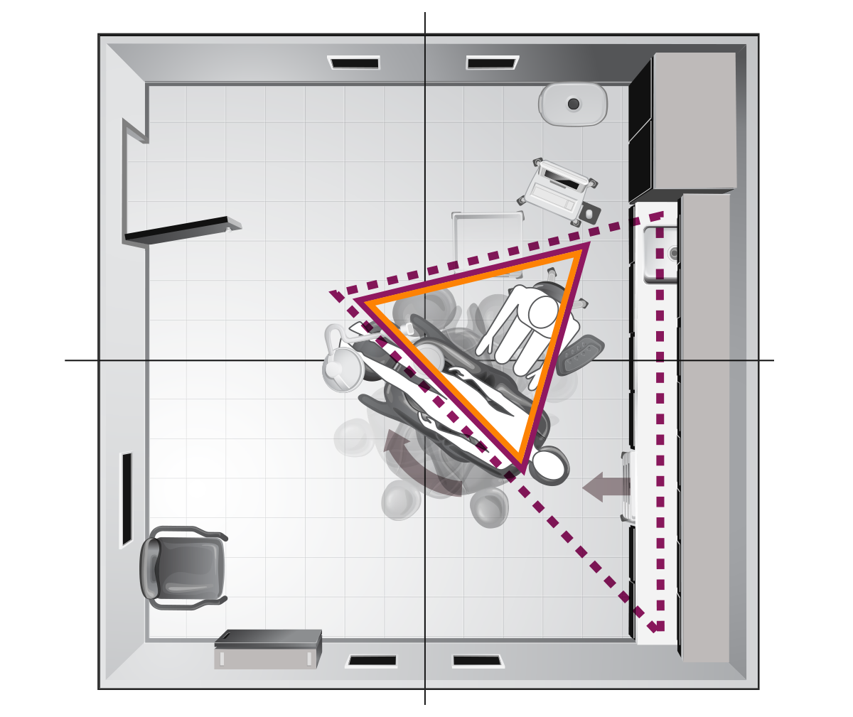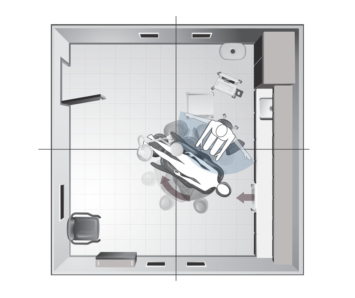 Procedure Zone EfficiencyThe procedure zone is designed around the caregiver, providing access to the patient, work surfaces and supplies. Rotation of the procedure chair allows the physician to efficiently reposition the patient as needed during the procedure for better access. -