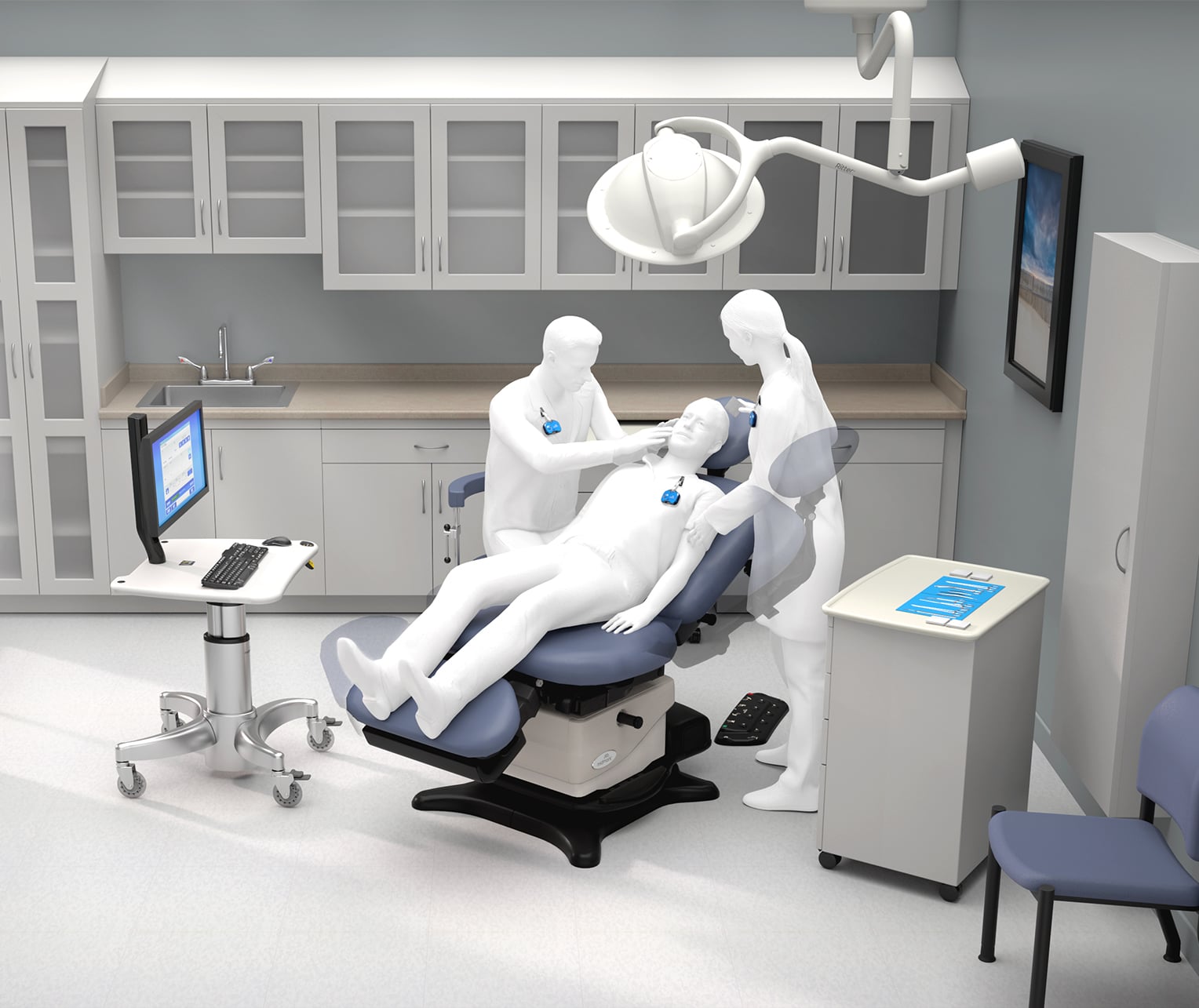 Procedure CenteredOnce the patient is positioned on the chair, the procedure zone is designed to support the caregivers. Mobile carts and mobile work surfaces (that are part of the storage system) create a more efficient procedure zone, helping the provider avoid excessive clutter before, during and after the procedure and limiting excessive steps. -